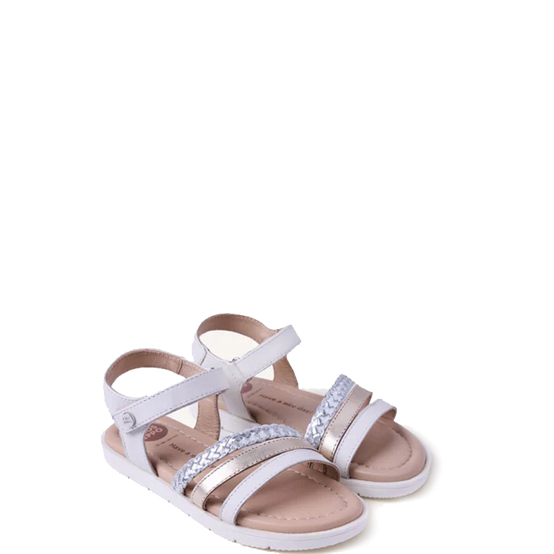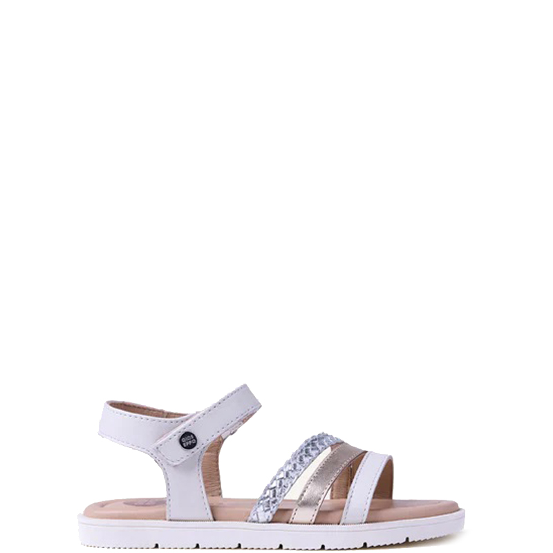 Sandalia de piel con trenzado. Tiras multicolores y detalles metalizados. Cierre ajustable en el tobillo. Planta acolchada. Suela flexible de TPR.