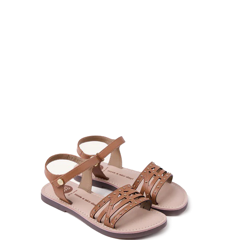 Sandalia de piel con detalle de tachas en acabado dorado. Cierre ajustable en el tobillo. Planta acolchada. Suela flexible de TPR.